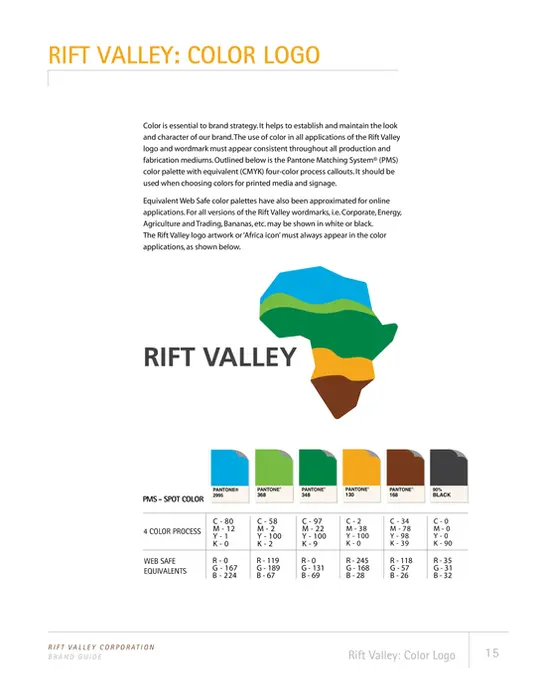 Description: Consolidated under a unified Rift Valley Corporation brand a hodgepodge of various logos for the many companies and business units. Rolled-out new website, stationary, signage, business cards, etc. Seven new platforms included Agriculture & Trading, Bananas, Energy, Forestry, Juice, Tea, and Tobacco.